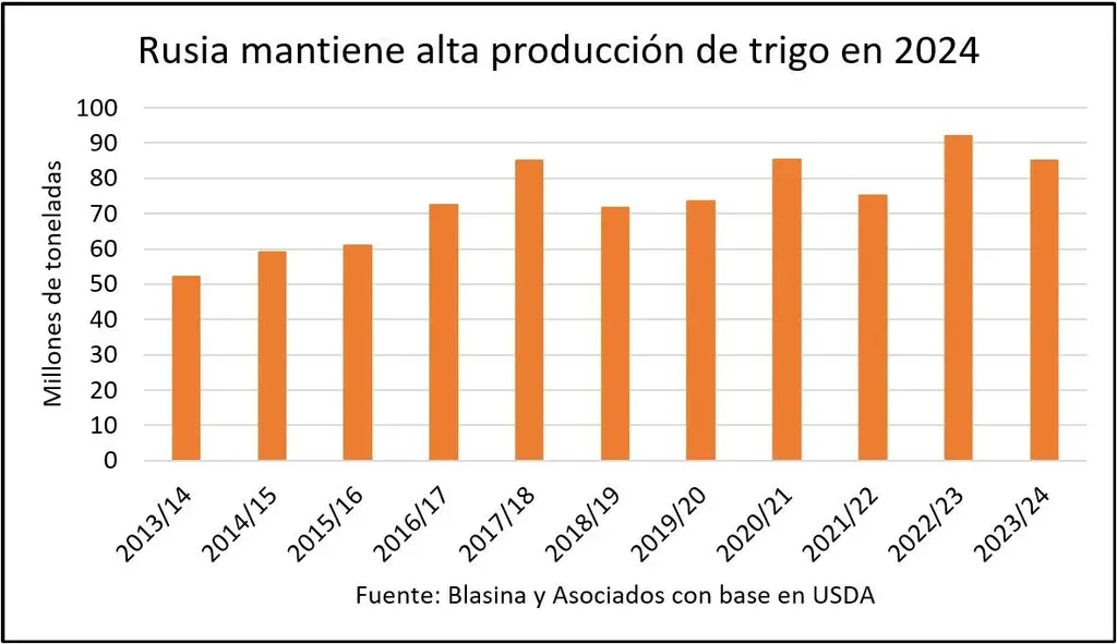 El stock mundial va por su cuarto año consecutivo de caída y está en los niveles más bajos desde la zafra 2015/16. La producción 2023/24 fue corregida a la baja hasta 783 millones de toneladas desde el récord de 790 millones de toneladas en la campaña pasada, como consecuencia de la menor producción de Australia.
