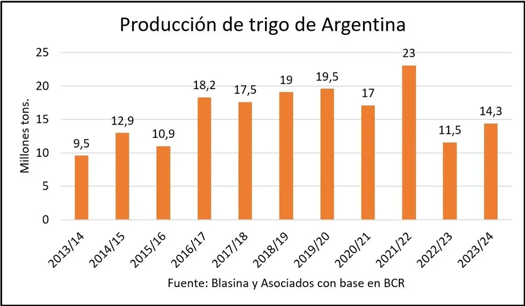 La disponibilidad de trigo argentino para vender al exterior desde la próxima cosecha hasta diciembre de 2024 se ajusta al volumen más bajo en casi 10 años, unos 5,1 millones de toneladas.