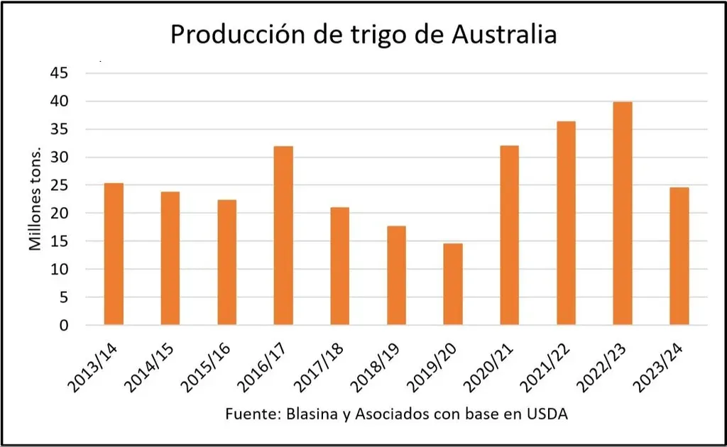 La producción de trigo en Australia es el factor más influyente en el cambio de equilibrios. Caerá casi 40%, desde más de 39 millones de toneladas en la campaña récord del último año hasta 24,5 millones de toneladas como consecuencia de la severa sequía, con rendimientos muy por debajo del promedio.