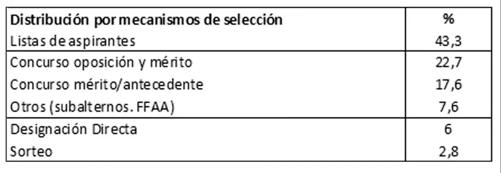 Hasta ahí lo formal. Pero uno de los focos de atención en este análisis está en los mecanismos de selección. Es allí donde podemos ver la transparencia en el reclutamiento de personal del Estado. La siguiente tabla es tomada de los datos de la ONSC para 2019.