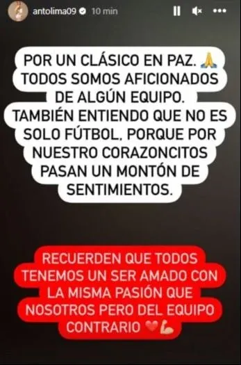 “Por un clásico en paz. Todos somos aficionados de algún equipo”, escribió en su Instagram. “También entiendo que no es solo fútbol, porque por nuestros corazoncitos pasan un montón de sentimientos”, agregó.