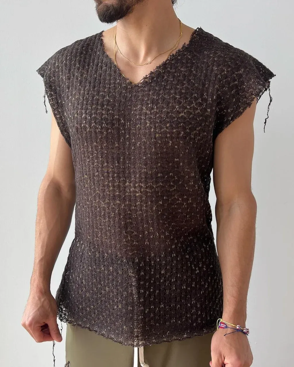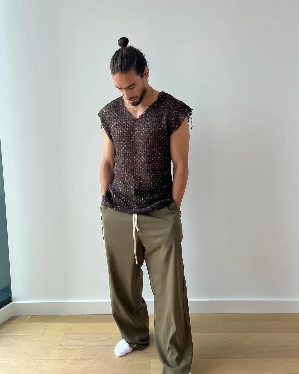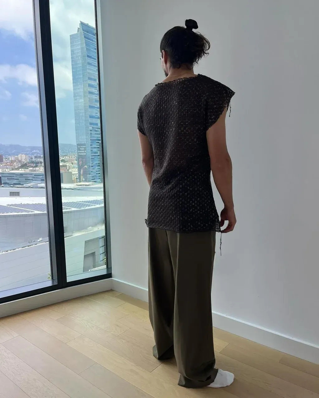 El Pelado lució un “top de lana (en proceso) con detallado de hilo metálico + Pantalones de algodón suave con cordón”.