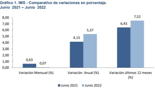 El Índice Medio de Salarios Nominales (IMSN) de junio 2022 registró una variación mensual de 0,08%, acumulada en el año de 5,35% y en los últimos 12 meses de 7,52%.
