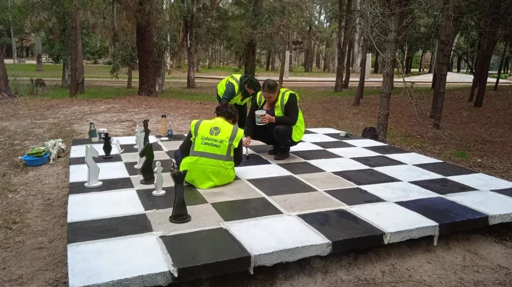 Ajedrez gigante. En el Parque Roosevelt ahora se puede jugar al ajedrez al aire libre y en tamaño XXL. La Intendencia de Canelones decidió que parte de los uruguayos contratados para trabajar en el programa Jornales Solidarios se dediquen a limpiar y construir propuestas lúdicas en ese parque, entre ellas este superajedrez.