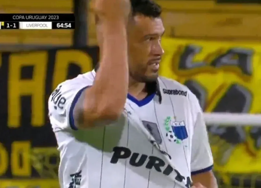 Se tocó el escudo de campeón uruguayo y con su mano derecha hizo el gesto que dio la vuelta olímpica en ese escenario.