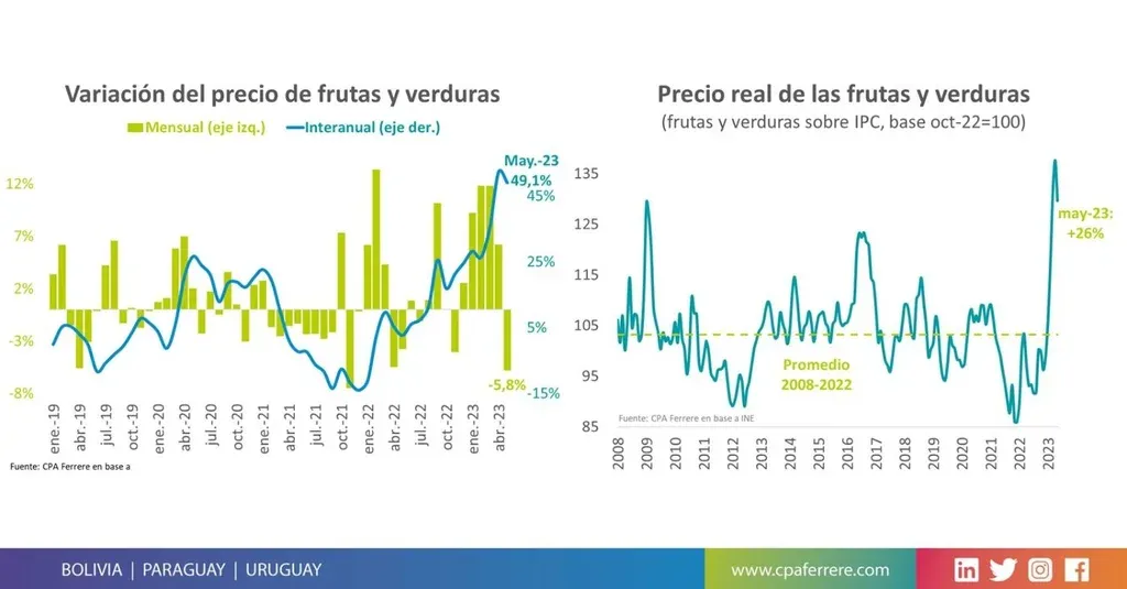 Las frutas y verduras subieron entre 40% y 50% en los últimos 12 meses. Con ello su precio real está en valores máximos de los últimos 15 años. Estos productos se encarecieron fuertemente en los primeros meses de este año como consecuencia de la sequía que ha golpeado al país.