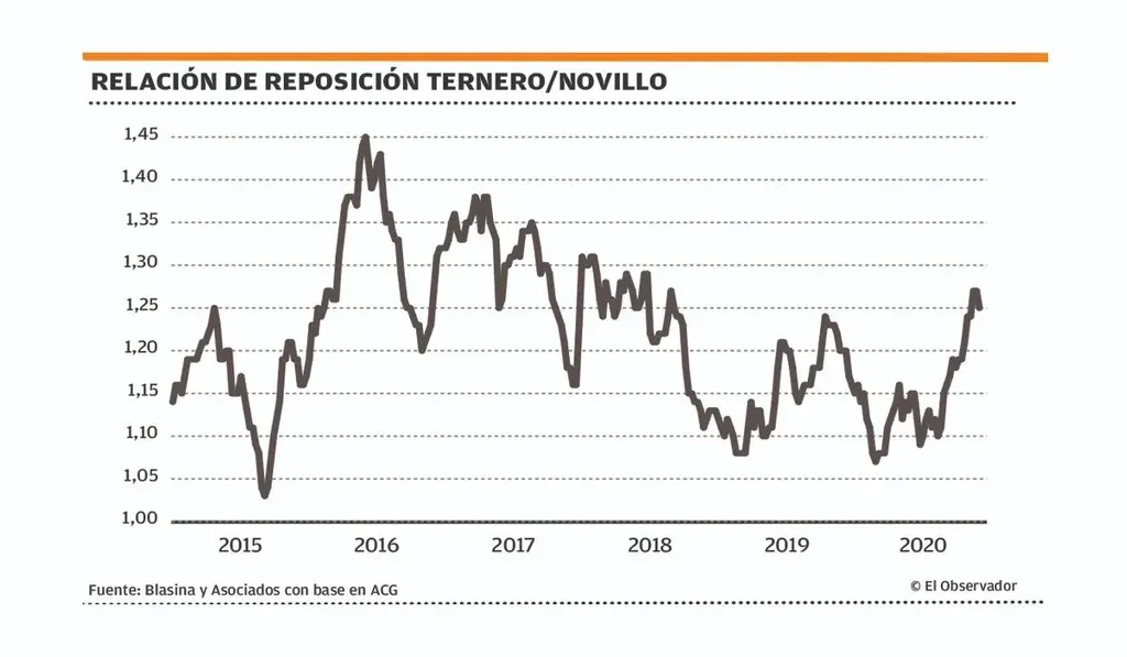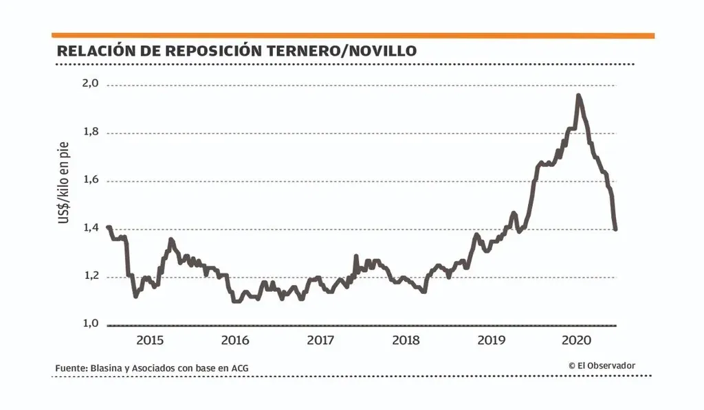 Para encontrar una relación tan adversa al invernador hay que remontarse a 2016/17. En aquel entonces una contaminación con etión afectó a la carne mientras la exportación en pie sostuvo los precios de los terneros y novillos chicos. Luego el ganado gordo fue subiendo y equilibrando la ecuación. La relación de reposición se mantuvo en valores relativamente altos, aunque con una tendencia a la baja durante 2017, 2018 y 2019 –con precios récord de hacienda gorda–. En 2019 la relación de reposición promedió 1,15, apenas por debajo de la relación de 1,16 de 2018 y muy por debajo del 1,30 de 2017.