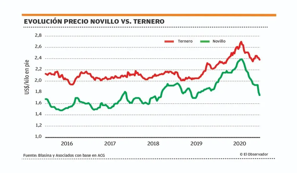 La caída ha sido de 30% en el precio del novillo gordo respecto al pico histórico de US$ 4,35 por kilo de carcasa, a US$ 3,10 la semana pasada. El ternero, a US$ 2,40 por kilo, está solo 10% por debajo de los US$ 2,70 de la primavera.