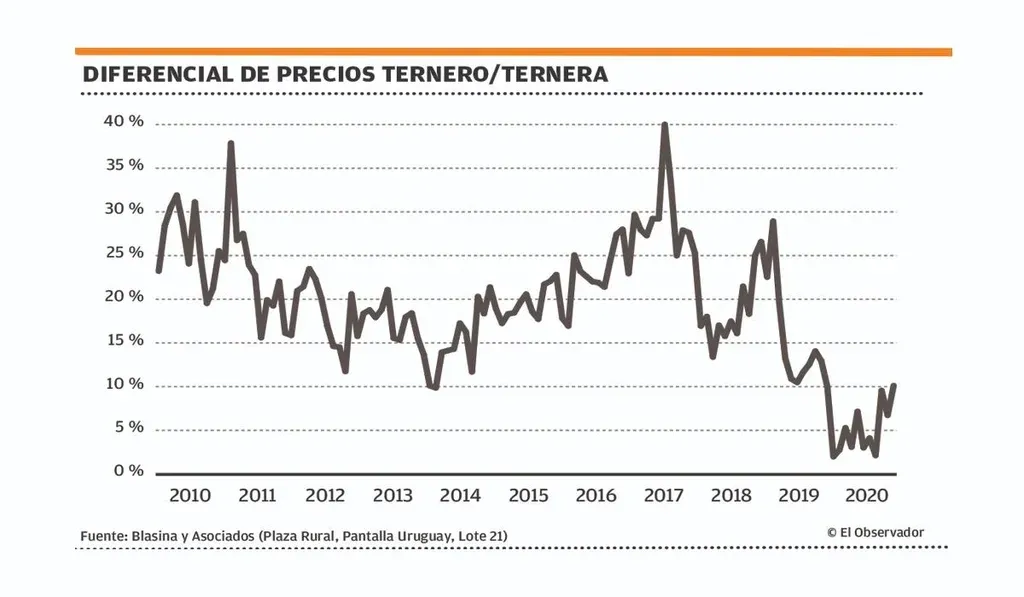 La diferencia entre el precio del ternero y la ternera está desde comienzos de 2019 en los niveles más bajos registrados. Es de 8% a 10%, cuando habitualmente entre categorías hay una brecha de 20% y más. Hay retención e interés en recriar y engordar lo que se pueda lo que lleva al precio de las terneras a superar holgadamente los US$ 2 desde comienzos de 2019, luego de ocho años por debajo de esta referencia. En el momento de mayor optimismo el diferencial fue casi cero, mostrando una fuerte avidez por aumentar la cría.