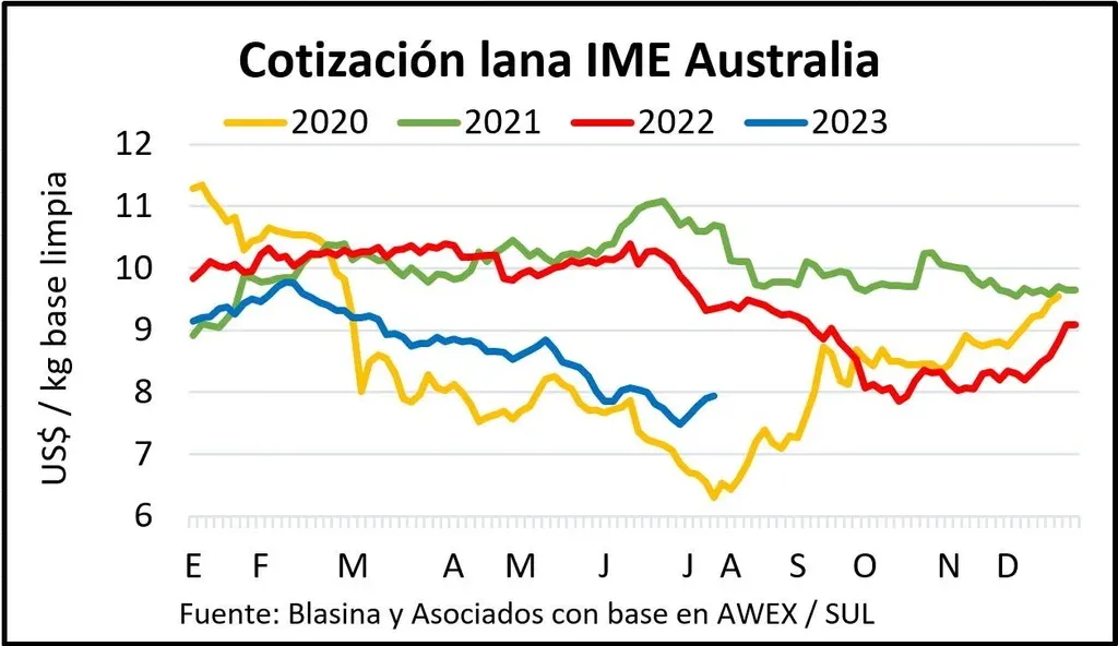 El mercado de lana de Australia se fue al receso de tres semanas con una tónica alcista, una postura bien diferente a la que traía hasta fines de junio. El Indicador de Mercados del Este (IME) subió 6% en dólares en las primeras dos semanas de la zafra 2023/24, un avance de US$ 0,46 en las últimas cuatro jornadas de subastas.