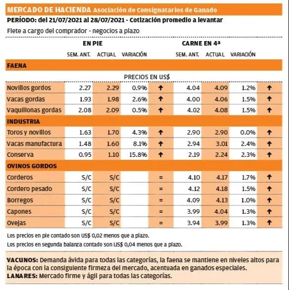 La mayoría de los negocios para este tipo de ganados se ubica en el eje de US$ 4,35. Para novillos “faltones”, en el entorno de US$ 4,15. La vaca especial y pesada en los últimos días ha alcanzado valores que van de US$ 4,10 a US$ 4,15. En todos los casos, con cargas que sigue dinámicas, entre una semana y 10 días.