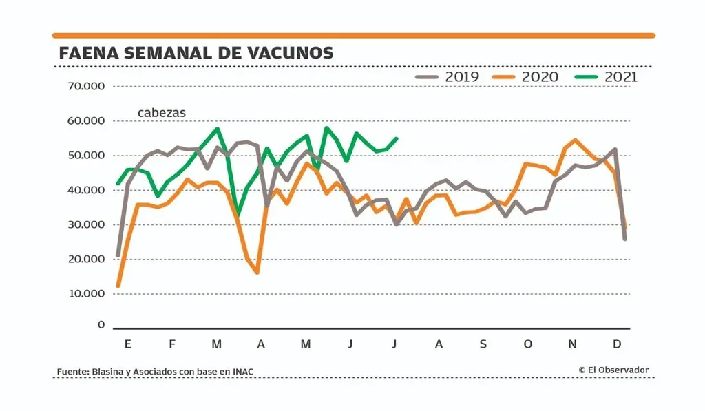 Julio cierra con una faena récord. La semana pasada casi se alcanzaron los 55.000 vacunos y hay expectativa por si podrá o no mantenerse el ritmo de actividad, teniendo en cuenta que en agosto comienza una nueva ventana de faena de ganado de corral con destino a cuota 481. Tampoco está claro si el comienzo de la faena para cuota tendrá mayor incidencia sobre los precios. Lo que sí está claro es que la faena en lo que va del año ya supera en casi 33% el volumen registrado en 2020 y también el de 2019, aunque con una brecha menor.