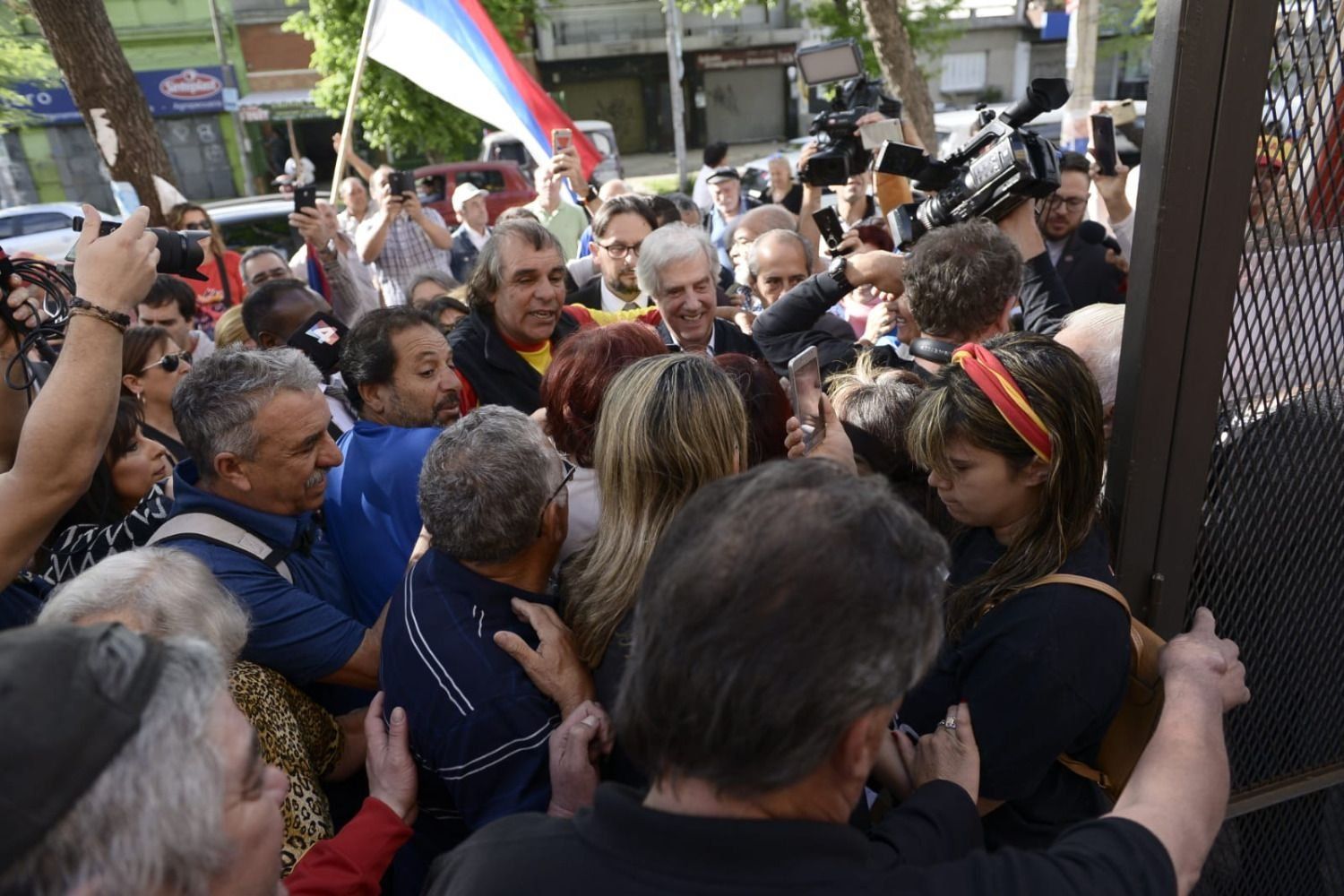 “Mucha fuerza” y “Arriba”, gritaron las personas que, embanderadas del Frente Amplio, vitorearon al presidente mientras se abría paso para entrar al Club Progreso en La Teja. Pero lo que más se escuchó fueron los “gracias”. Uno de los guardaespaldas despejó una zona para que el presidente pasara con más tranquilidad. Al lado del custodio había un hombre con una camiseta amarilla y roja, los colores de Progreso. “No te preocupes”, le susurró. “Si alguien toca a Tabaré, cobra. Tabaré nos vio nacer a todos acá”.
