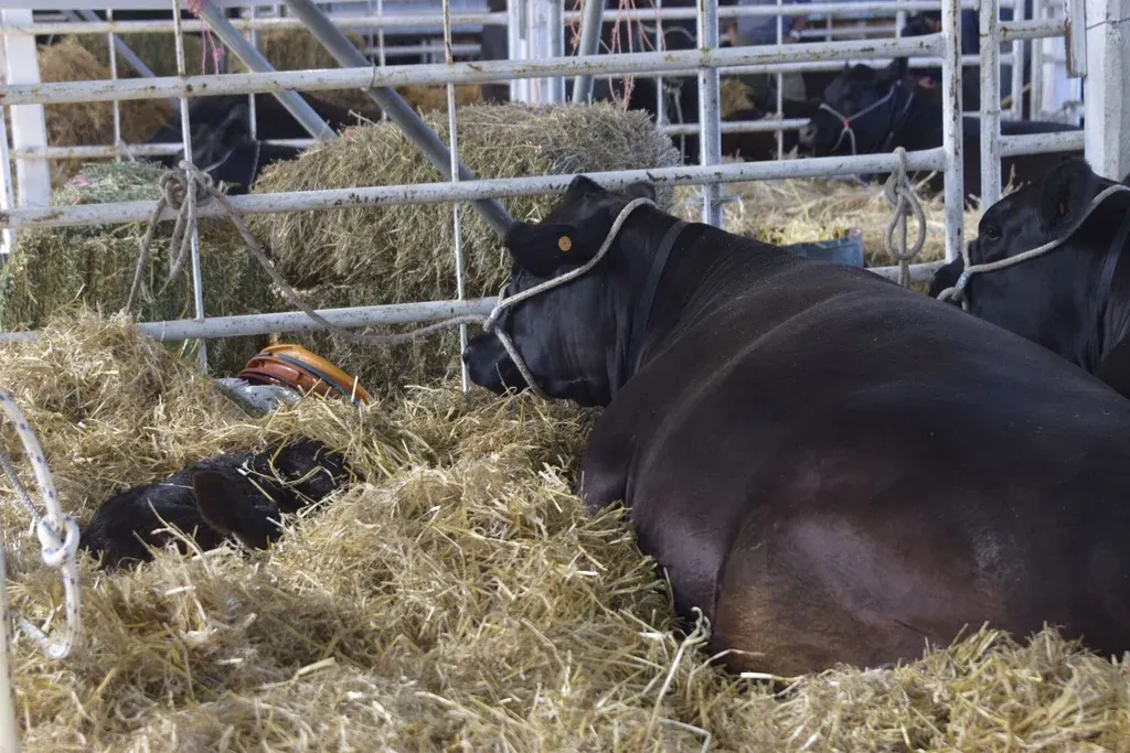 En el galpón donde se encuentran los Aberdeen Angus una madre descansa junto a su ternero de 15 días de nacido, mientras que en la guardería de corderos, hay una madre con corderos mellizos que nacieron dos días antes de que comenzara la exposición.