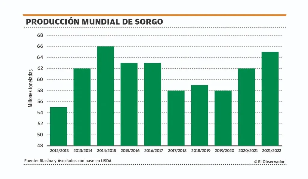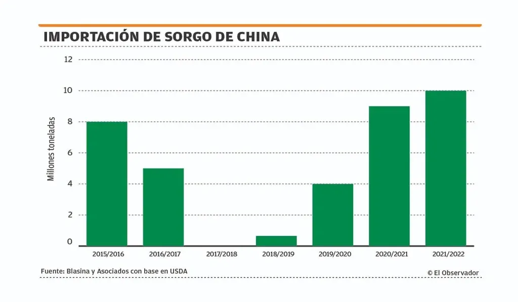 Hasta 2012, las importaciones de sorgo de China no superaban las 100.000 toneladas por año, y estaban esencialmente destinadas a la producción de aguardiente. La necesidad china de aprovisionarse de granos forrajeros para abastecer la demanda del sector avícola y porcino llevó a que en el año 2013 crecieran a un millón de toneladas y luego a 8 millones de toneladas en 2016. Luego, se desplomaron por la crisis de la fiebre porcina africana y en los últimos dos años mostraron una recuperación sostenida para superar en 2021 los 8 millones de toneladas, que aumentarán en 2022 a más de 10 millones.