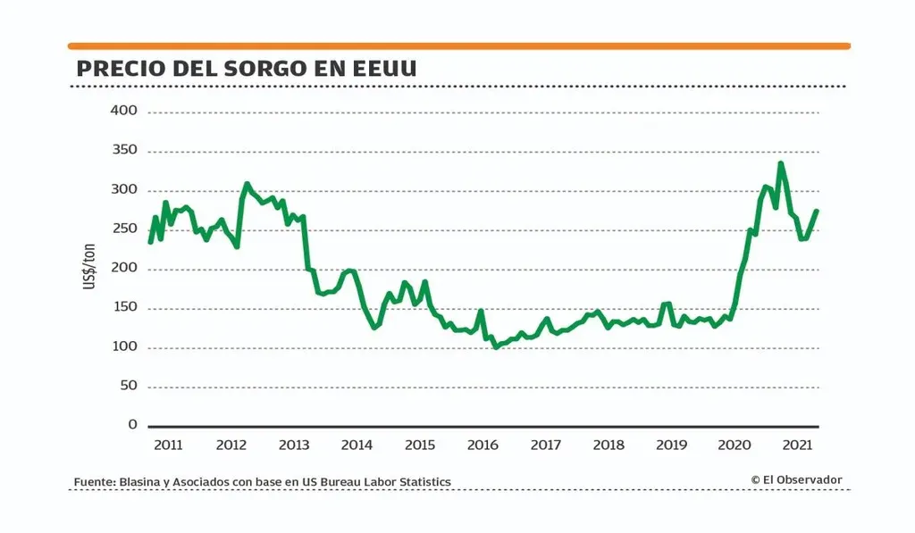 Como otros commodities agropecuarios, el precio internacional del sorgo dio un salto en el último año. Cruzó el techo de los US$ 200 en octubre de 2020 y llegó a un pico de US$ 336 en mayo de 2021, para estabilizarse arriba de los US$ 250.