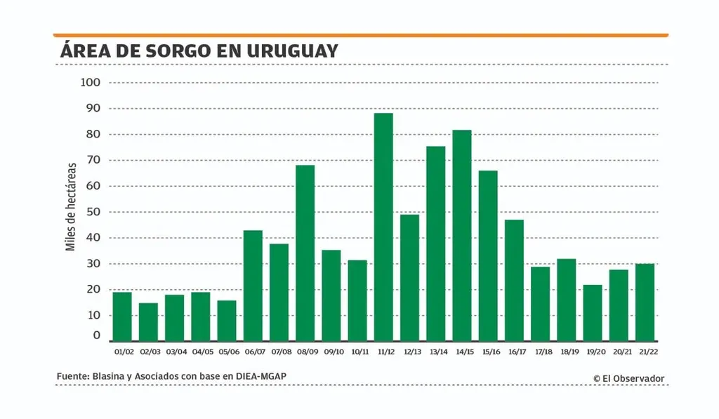 El sorgo que se produce actualmente en Uruguay tiene destino energético y forrajero y desde la campaña 2014/15 el área cultivada ha descendido sensiblemente.