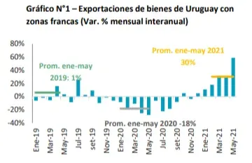 Las solicitudes de exportación incluyendo zonas francas se ubicaron en US$ 995 millones en mayo, pautando un incremento de 58,8% en términos interanuales. En igual mes del año pasado, las ventas al exterior de bienes de Uruguay habían tocado un piso de US$ 626 millones en medio del fuerte impacto que sufría el comercio mundial por los efectos de la pandemia.