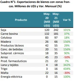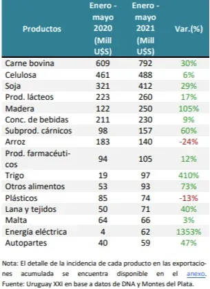 En el acumulado de los cinco primeros meses de 2021, las exportaciones totalizaron US$ 4.012 millones, lo que implica un aumento de 31% respecto a lo exportado en enero-mayo 2020. El arroz fue el producto con mayor incidencia negativa, seguido de los plásticos, pescados y productos del mar, y frutas cítricas. La carne, madera, soja, trigo, subproductos cárnicos y energía fueron los productos con mayor incidencia positiva en el acumulado de 2021.