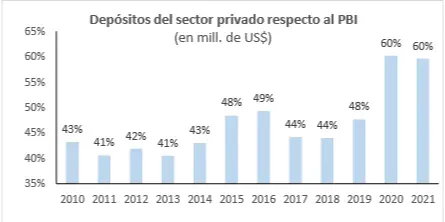 En relación con el Producto Bruto Interno (PIB), el monto de los depósitos del sector privado también alcanza un nivel significativamente alto si se observa la serie histórica. Esa medición, que permite comparar los depósitos con el “tamaño” de la economía uruguaya, pasó de 48% en 2019 a 60% en 2020 y 2021.