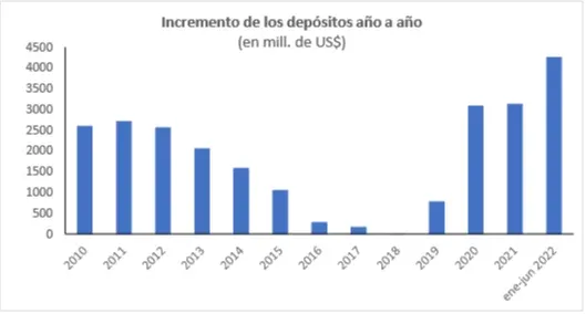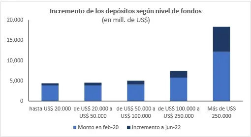 AEBU En un escenario en que los depósitos aumentaron 34% desde febrero 2020 (medidos en dólares), el incremento de las cuentas más grandes fue cinco veces el que ocurrió para las cuentas más chicas. Mientras las cuentas de más de US$ 250 mil aumentaron en 51% sus depósitos y las de más de US$ 100 mil lo hicieron un 30%, las de menos de US$ 5 mil los aumentaron en 10%.