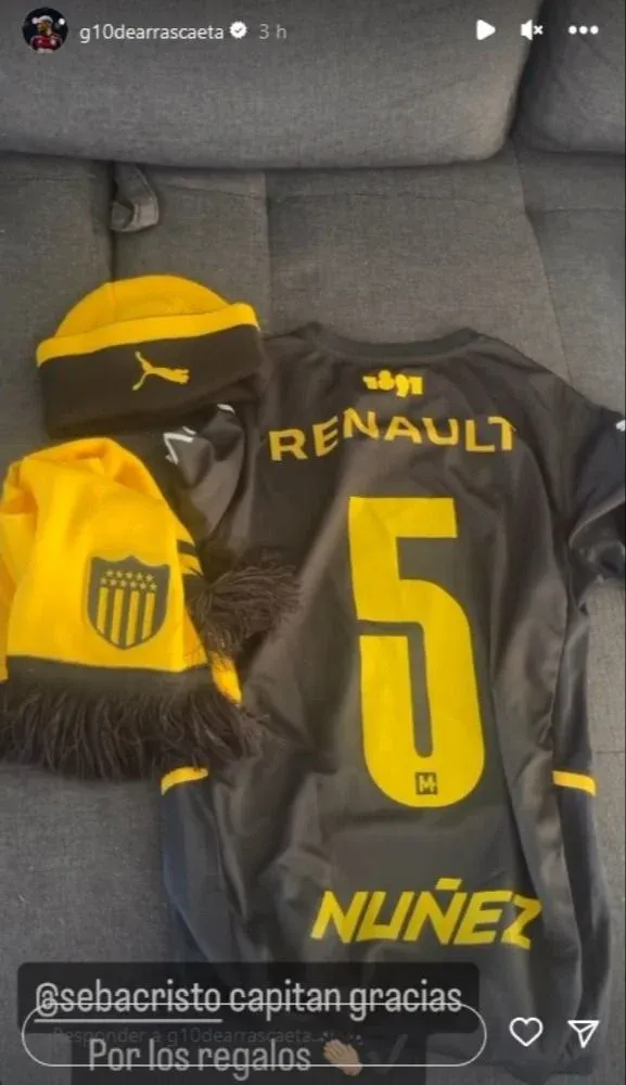 "@sebacristo capitán, gracias por los regalos", le escribió De Arrascaeta al volante aurinegro.