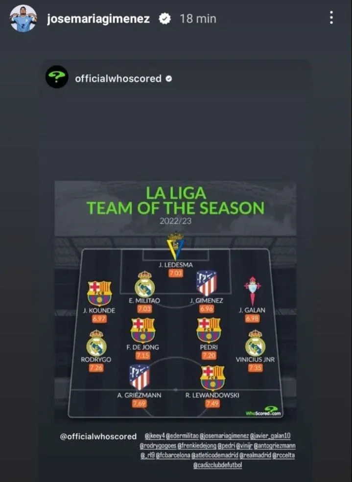 José María Giménez en dos equipos ideales de LaLiga de España