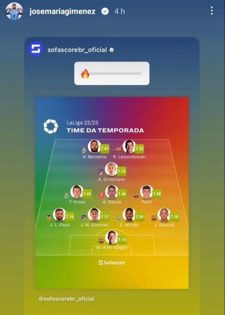 Una de ellas fue de SofaScore Brasil, en la que aparece como único uruguayo del equipo ideal formando la defensa con 7.17 puntos, junto Militao de Real Madrid (7.24), Kounde de Barcelona (7.10) y Gayá de Valencia (7.16).