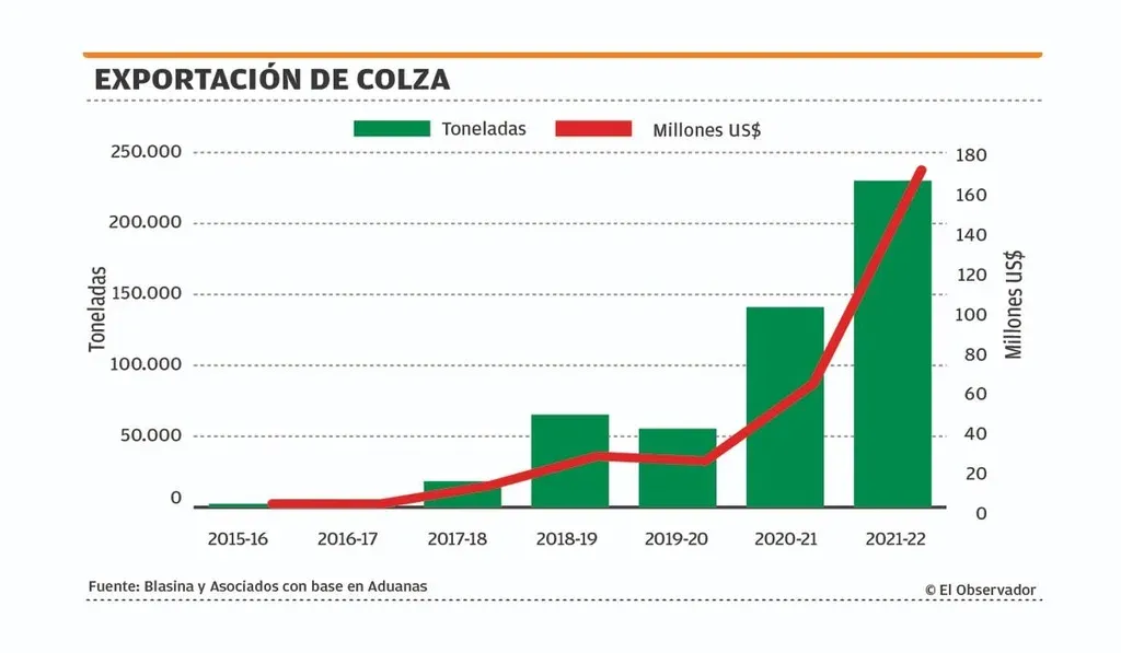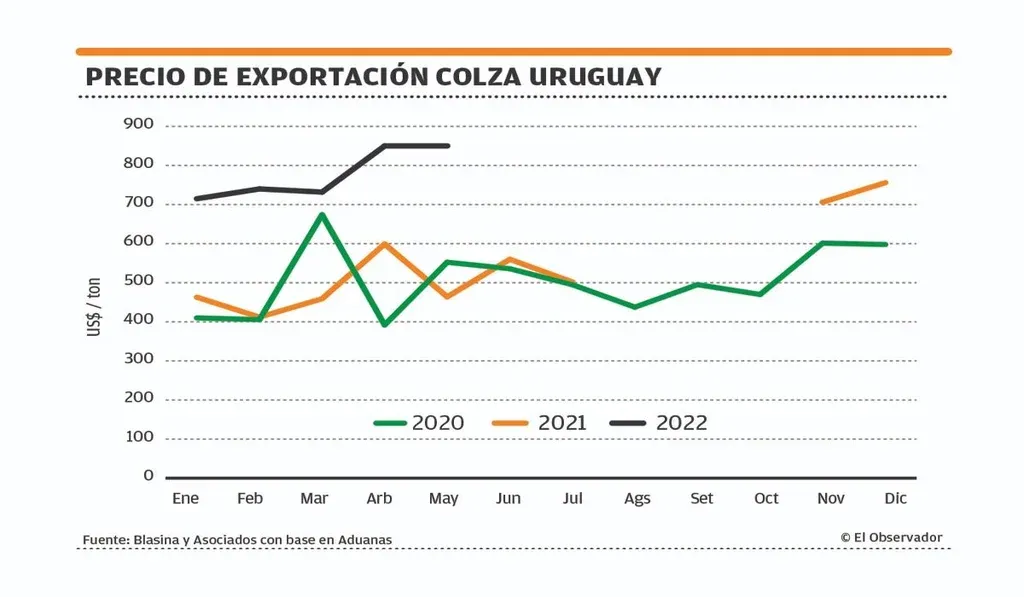 La colza de la cosecha 2021/22 se vendió a entre US$ 700 y US$ 850 la tonelada, con una facturación total de US$ 170 millones.