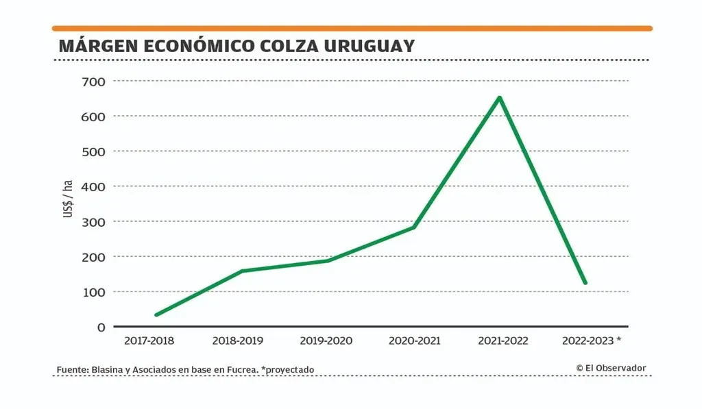 Los resultados variarán y dependerán de la fertilización, afirmó. La proyección de Sofoval está hecha con base en un rendimiento de 2.000 kilos por hectárea. Sofoval calculó los costos del cultivo de colza en US$ 932 por hectárea y, a un precio de US$ 505 por tonelada, el margen sería de unos US$ 78 por hectárea.