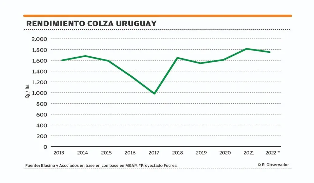 El desarrollo de la colza en Uruguay ha sido tan explosivo que desde ser un cultivo marginal 10 años atrás ha pasado este invierno a superar por primera vez al trigo y la cebada para quedarse con el primer puesto entre los cultivos de invierno, y con el segundo entre todos los cultivos, solo detrás de la soja.