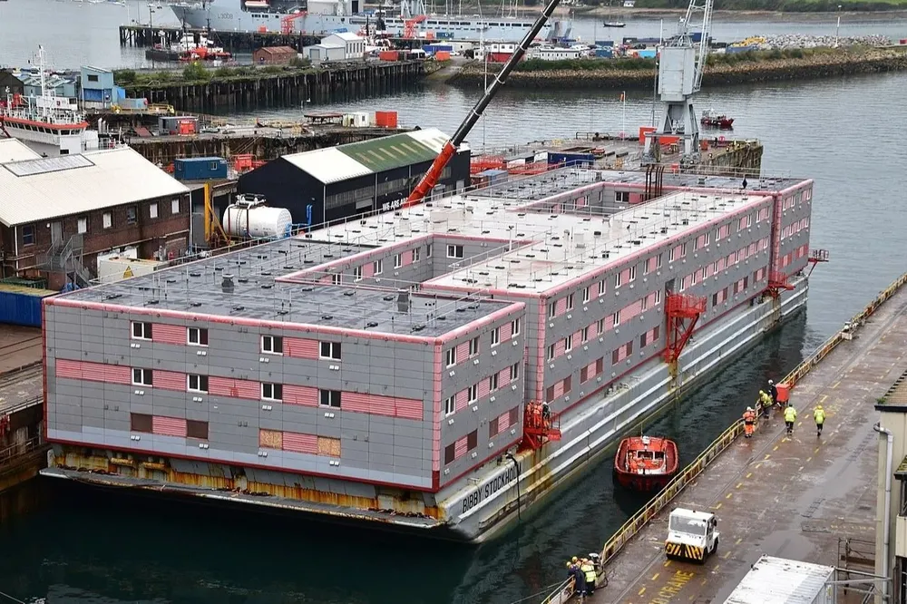 La semana pasada, el Bibby Stockholm fue sacado de un dique seco del puerto de Falmouth, tras una remodelación que le permitirá dar alojamiento a 500 personas.