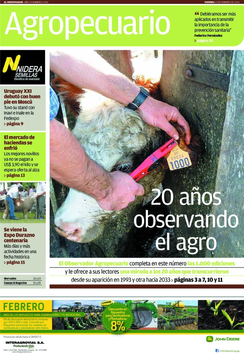 Los lectores tienen en sus manos El Observador Agropecuario N° 1042, la última selección semanal del año de noticias, informes y análisis. Y si bien ya estamos elaborando contenidos para el primer suplemento de 2014, concluye un ciclo en el que hemos elaborado 51 ediciones divulgando sucesos y perspectivas en el mundo de los agronegocios, aquí y en el exterior, en un escenario cada vez más dinámico y de creciente trascendencia para la economía nacional y la sociedad toda, no solo para los directamente involucrados.