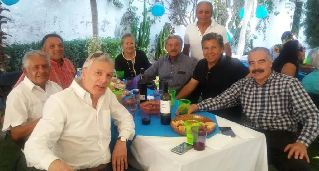 Lorenzo Unánue aparece en primer plano a la izquierda en una foto de la actualidad en una reunión con amigos