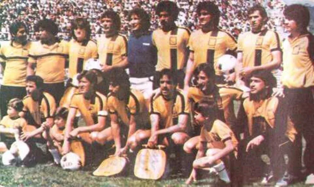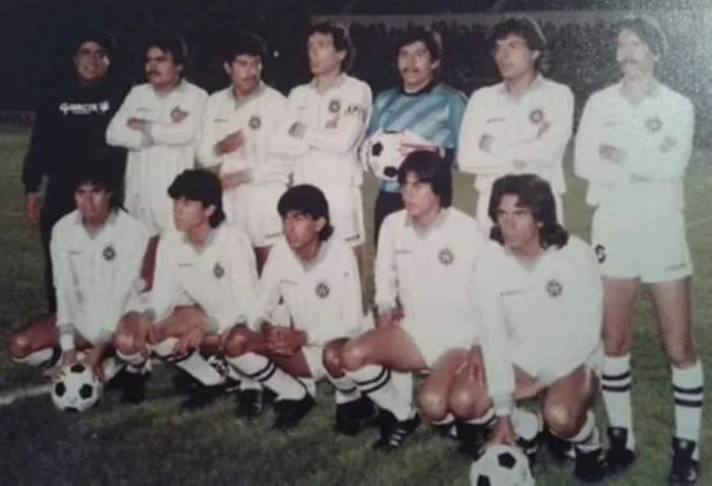 Lorenzo Unánue cuando defendió a Tecos de Guadalajara; a su izquierda aparece el uruguayo Eduardo Acevedo, en tanto abajo, se puede apreciar claramente a otro compatriota: el Pato Aguilera