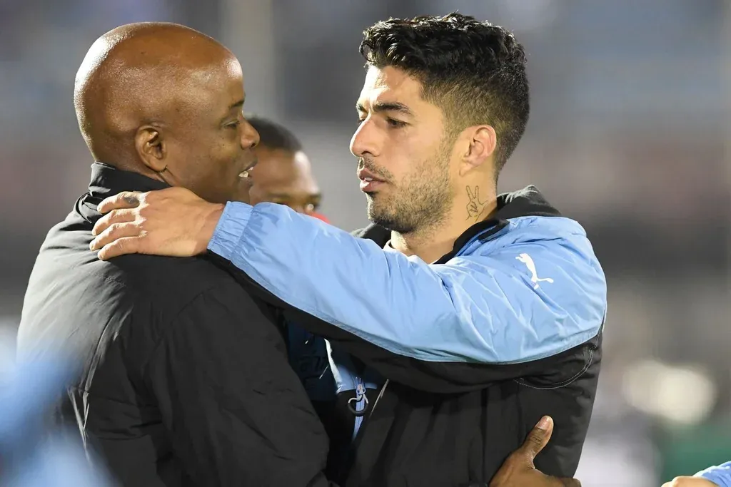 Dely Valdés cuando dirigió a Panamá ante Uruguay en 2019, y un abrazo muy especial con Luis Suárez