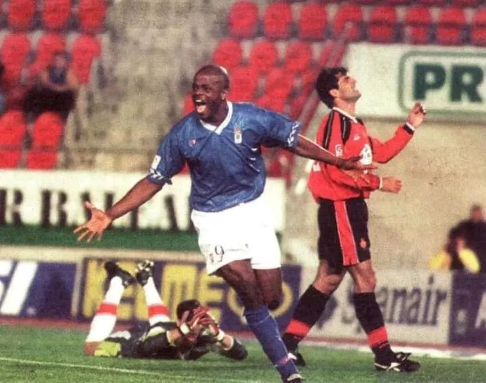 Julio César Dely Valdés festejando un gol con la camiseta de Oviedo de España