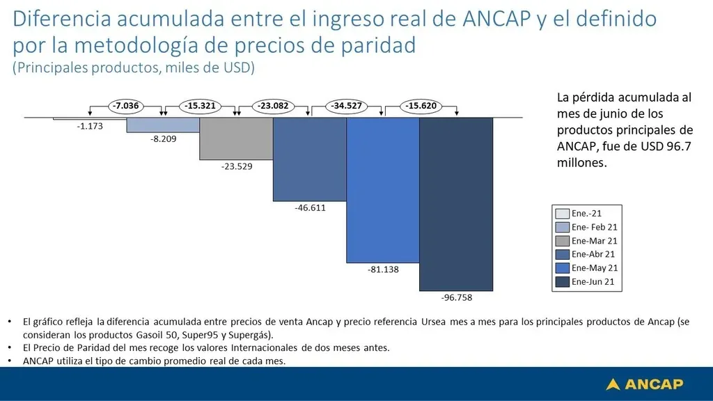 En el primer semestre del año la diferencia acumulada entre los precios de venta de Ancap y el Precio Paridad de Importación (PPI) de la Ursea, representó una pérdida de ingresos de US$ 96,7 millones para la empresa estatal.