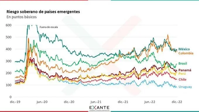 Con estos valores Uruguay destaca ampliamente entre países de la región, como se ve en esta gráfica de la consultora Exante. "Esa mejor percepción de riesgo país en parte responde a la dinámica de las cuentas públicas: el gobierno bajó el déficit fiscal y se encamina a cumplir holgadamente con la meta planteada para 2022", señalaron.