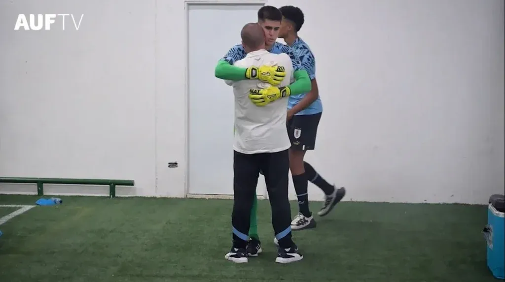 AUF TV Los abrazos del Ruso Pérez a los jugadores de la sub 20: con Facundo González Y también repitió con el 10 celeste, “el Cepillo” Franco González.