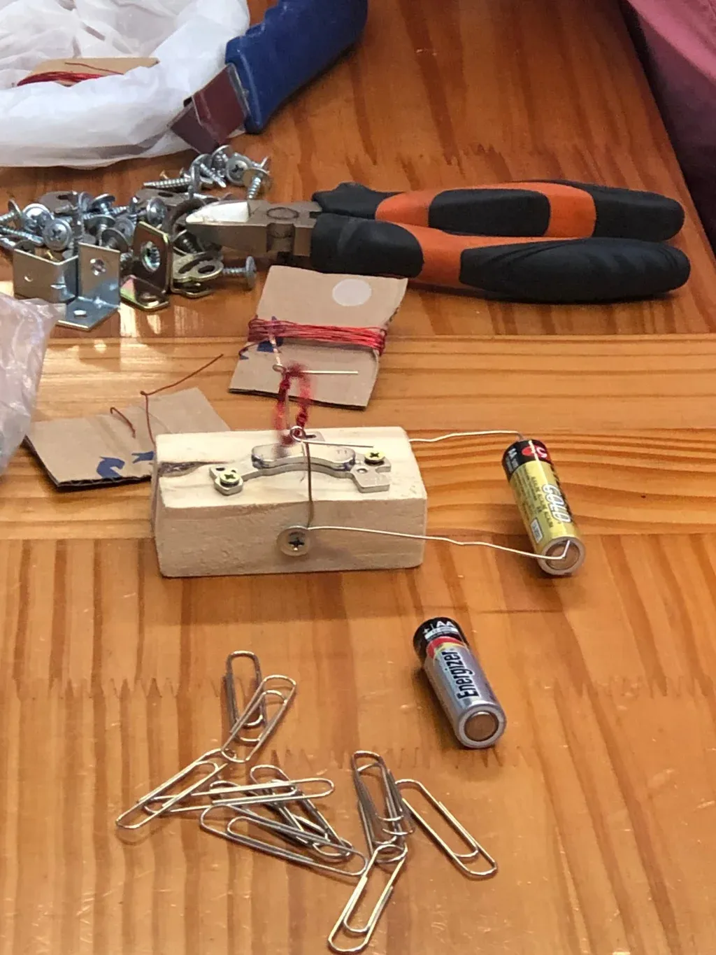 Este año, los alumnos desarmaron varias piezas de una computadora y, a partir de eso, crearon un motor utilizando los siguientes elementos: un imán de neodino, el disco duro, cuatro tornillos, un trozo de madera y dos clip de papel metálicos grandes, 10 vueltas de alambre de bobina que sacaron de un transformador viejo y una pila común AA.