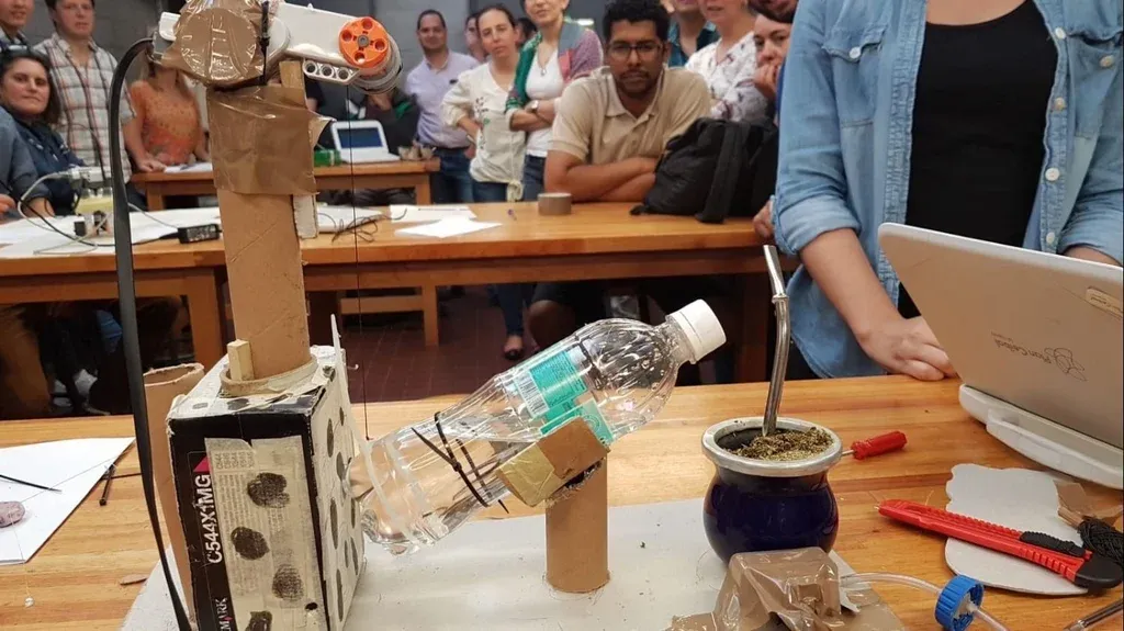 ¿Y qué fue lo que idearon García y sus alumnos? Un cebador de mate robótico. En una estructura hecha con madera y cartón se apoya el termo y el mate (en la imagen se ve una prueba con una botella de agua). Una vez que el mate es ubicado en el lugar predeterminado es detectado por un sensor de proximidad que activa el sistema para inclinar el termo y cebar el mate. El sistema controla también los tiempos de espera entre mate y mate.