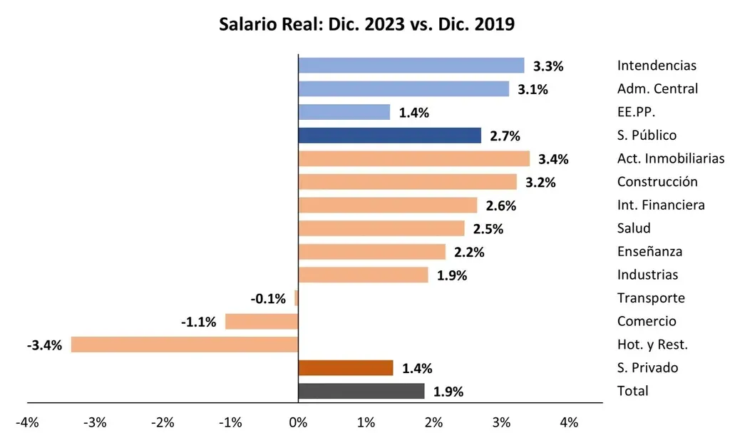 Es el caso de empresas públicas (+1,4%), intendencias (+3,3%) y Administración Central (+3,1%) dentro del sector público. Y de actividades inmobiliarias (+3,4%), construcción (+3,2%), instituciones financieras (+2,6%), salud (+2,5%), enseñanza (+2,2%) e industrias (+1,9%), dentro del sector privado.