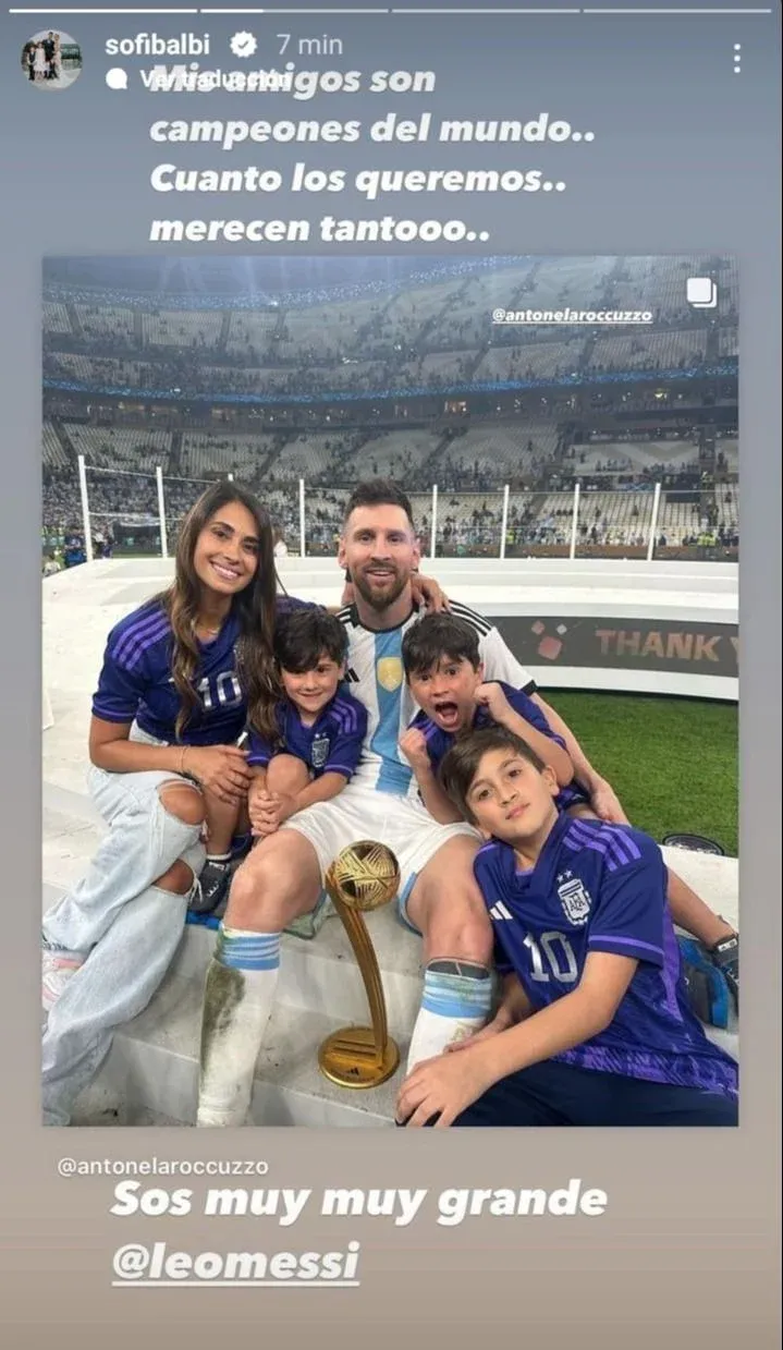 “Mis amigos son campeones del mundo. Cuanto los queremos… Merecen tanto…”, escribió Sofía en su Instagram compartiendo una imagen subida por Antonela Roccuzzo, la pareja de Messi en sus redes.