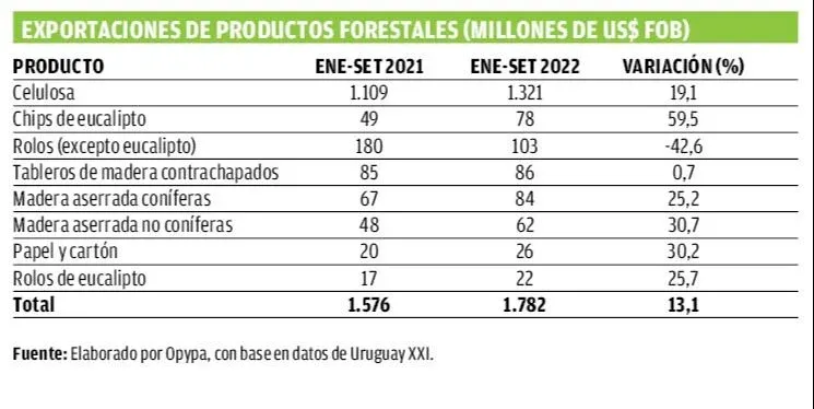 Uruguay importa producción del rubro forestal. Esas compras en 2021 mostraron una apreciación de 25% respecto a 2020 y alcanzaron los US$ 155 millones. Se espera que al finalizar 2022 las compras muestren un aumento del 18%, ubicándose en US$ 229 millones.