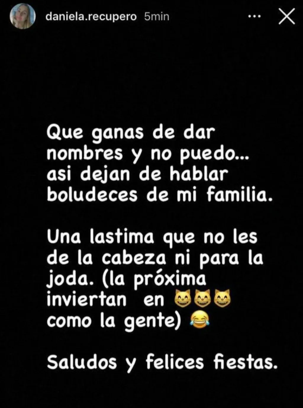 Daniela Recupero, esposa de Bergessio, escribió en Instagram: "Qué ganas de dar nombres y no puedo… así dejan de hablar boludeces de mi familia. Una lástima que no les dé la cabeza ni para la joda".