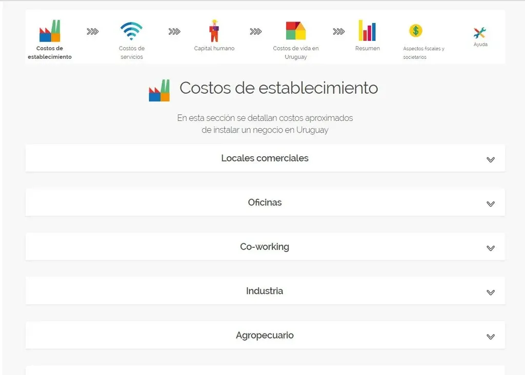 Uruguay XXI creó un simulador web que permite realizar el ejercicio para estimar los costos de establecimiento, ya sea en locales comerciales, oficinas, coworks, así como para la industria o el sector agropecuario en distintos rubros.