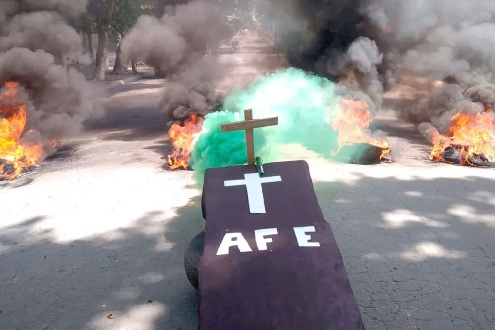 La Unión Ferroviaria realizó el viernes pasado una movilización que incluyó “el sepelio” y “la cremación” simbólico de AFE, según definió el sindicato. Los trabajadores quemaron cubiertas y cortaron la calle frente a los talleres de la empresa en Aparicio Saravia y Rivarola en el barrio Peñarol. Allí colocaron un ataúd envuelto en tela de color negro acompañada de una cruz simulando el entierro del cadáver del ente.