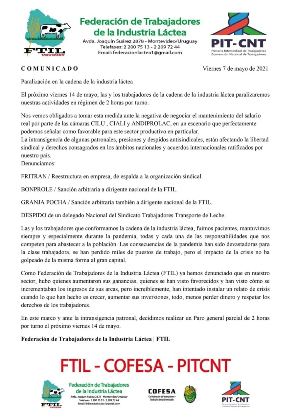 En un comunicado difundido por el sindicato y la Confederación de Federaciones y Sindicatos de la Alimentación (Cofesa) del PIT-CNT, los trabajadores alegan que las cámaras industriales se niegan a negociar el mantenimiento del salario real “en un escenario que perfectamente podemos señalar como favorable para este sector productivo en particular”.