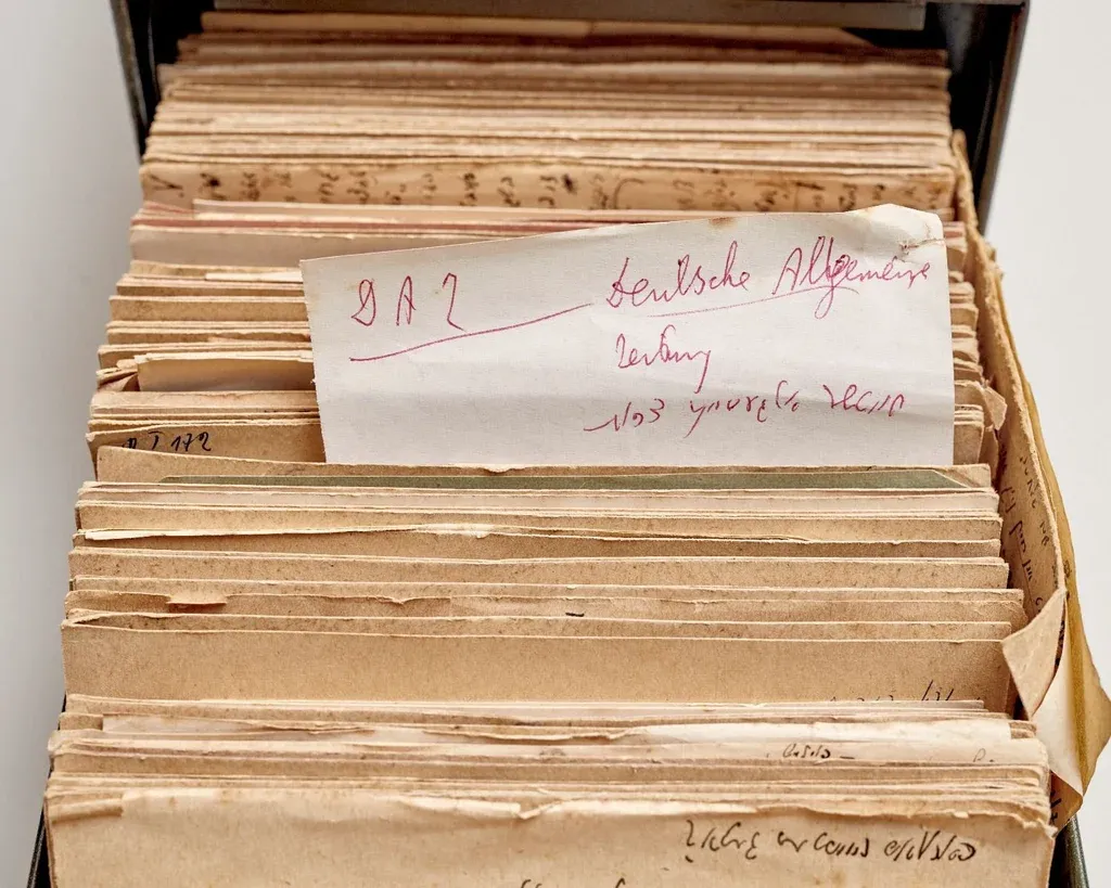 No obstante, estos objetos se ven eclipsados por miles de tarjetas de notas llenas de su minúscula caligrafía. Cada una contiene unas cuantas oraciones de textos nazis y la etimología de una palabra alemana específica con su significado original y su sentido alterado. Se trataba de la investigación para la tarea orwelliana de Blumental: un diccionario nazi.